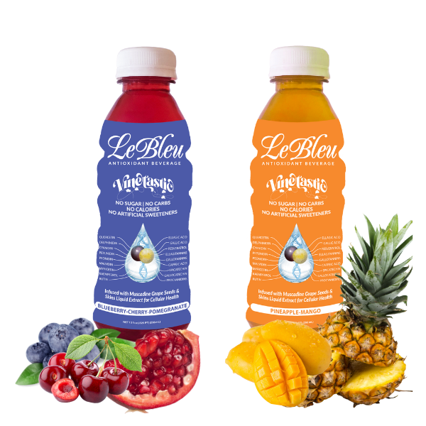 Experience the refreshing taste and health benefits of our Muscadine beverages —Vinetastic® and Mighty Muscadine®— packed with powerful antioxidants to boost your vitality. Made with Le Bleu Ultra Pure Water and Muscadine Grape Seed and Skin Extract, working in perfect harmony. No Sugar, No Carbs, No Calories, and No Artificial Sweeteners.